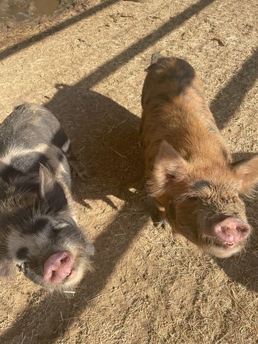 Hi there! We’re Mabel and Lucy. We’re a small breed of pig (only ~200 lbs!) with a friendly and docile nature, sporting our signature hairy coats and rotund builds. You might even notice our charming wattles hanging from our jaws! We're smart, too. We know to come when we're called, sit on command, and spin for a treat! We’re excited to soak up all the pets and attention we can get. Just be warned, we WILL try to untie your shoelaces! We can’t wait to snuggle and play with you!