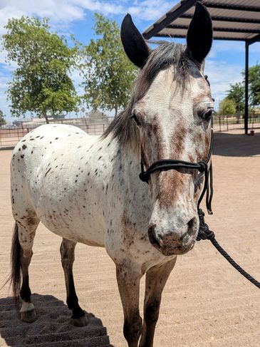 Hi, I’m Pongo—the youngest (and if you ask me, the most handsome) member of the herd! I’m a Quarter Pony Appaloosa with a one-of-a-kind coat pattern and even more unique multi-colored lips.